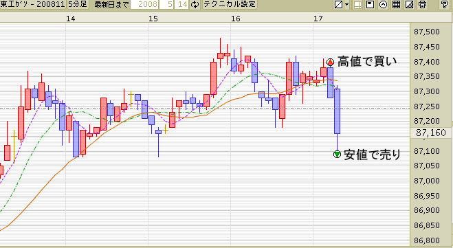 実際に一旦下がり、100円幅の利益が出ていたのと、
