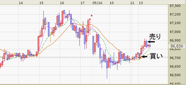 平均移動線もクロスし良いタイミングで売買できた。