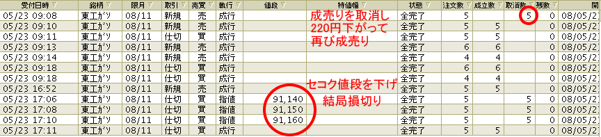 終了 30秒前に仕方なく 成 で損切り出すも約定ならず。
